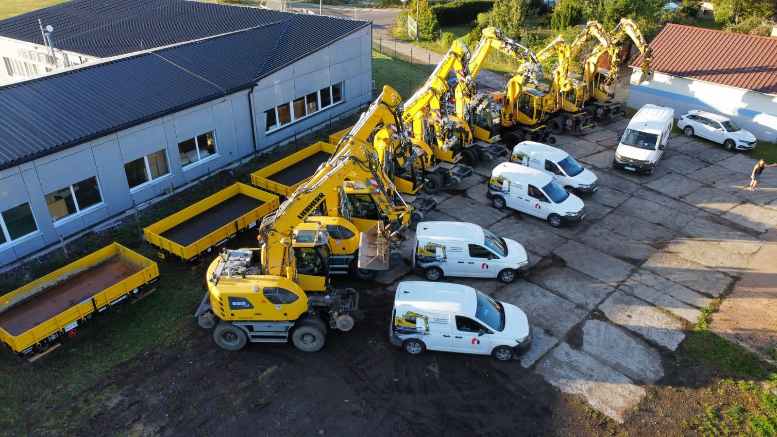 Široký vozový a strojní park – dvoucestné bagry Liebherr, jeřáby, nakladače, nákladní vozidla a specializovaná technika pro práce na železnici i ve stavebnictví.